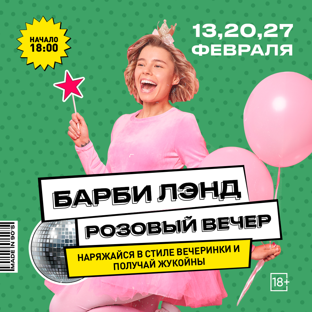 Нас ждёт розовый вечер, где девушки примерят образы самой знаменитой куклы, а бьюти-стойка поможет завершить любой лук. Кена тоже привели — без него Барби-пати не бывает! Первым гостям — специальный коктейль «Бабл гам», а свою куклу Барби можно обменять на коктейль ночи. Камон, Барби! Летс гоу, пати!