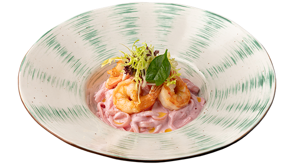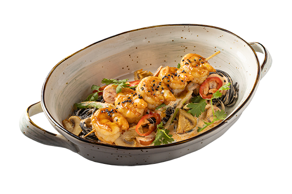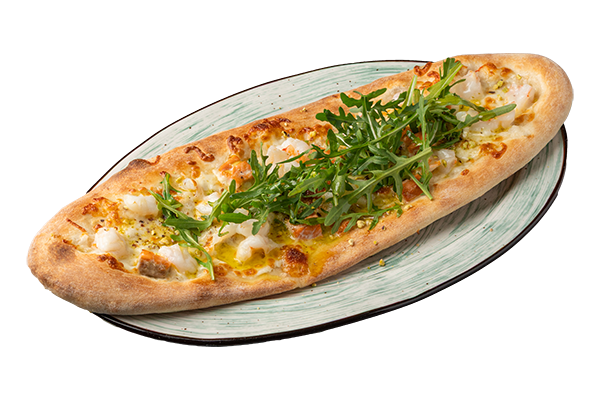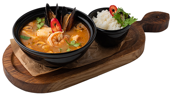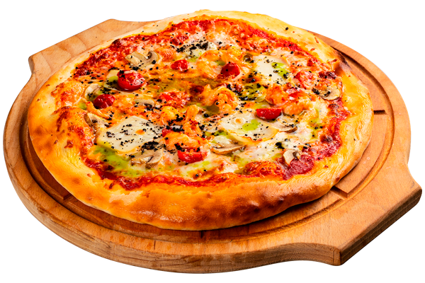 Томатный соус, сыр моцарелла, соус том ям, креветки, кальмар, шампиньоны, кокосовое молоко, помидоры черри