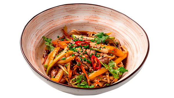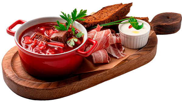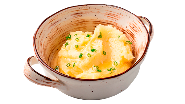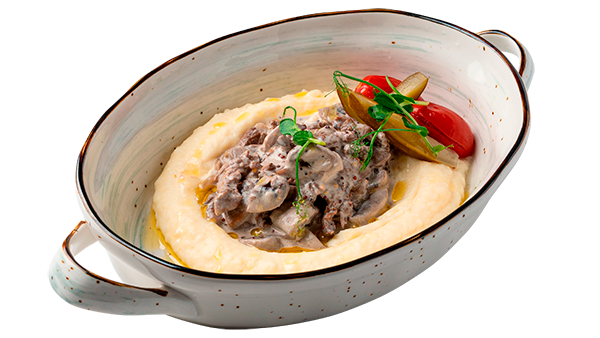 Бефстроганов из говядины с шампиньонами, картофельным пюре и маринованными овощами
