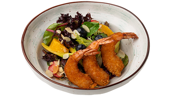 Зеленый салат с авокадо, свежими ягодами и хрустящими креветками