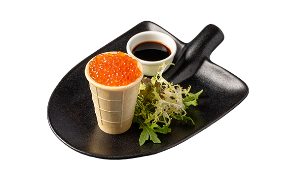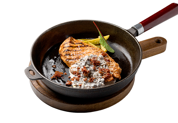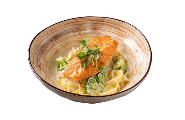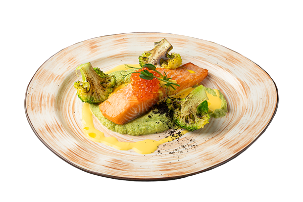 Филе дикого лосося с пюре из брокколи, сливочным соусом с шафраном и красной икрой