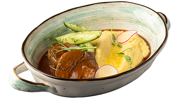 Телячьи щечки томленные в красном вине с картофельным пюре и малосольными огурцами