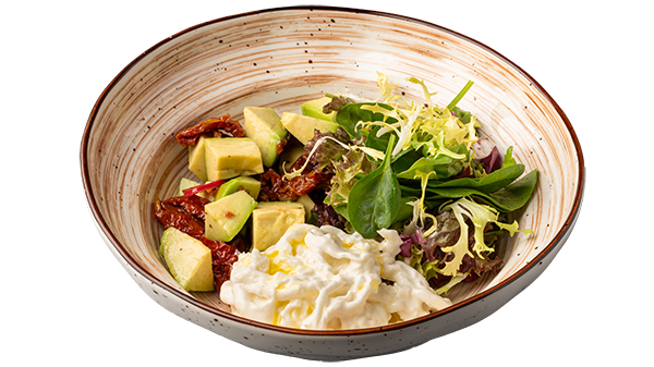 Зеленый салат из авокадо с вялеными томатами и молодым сыром