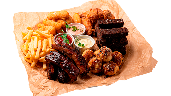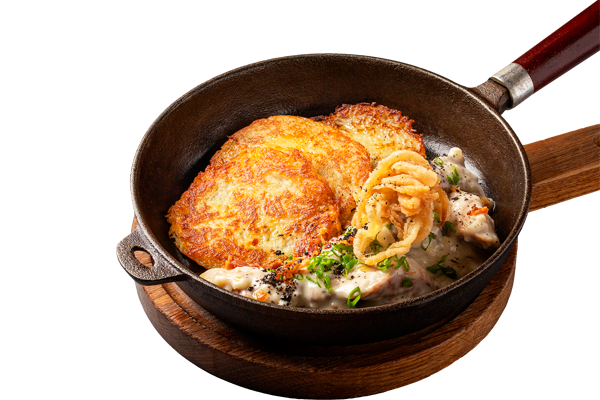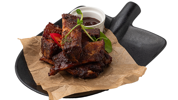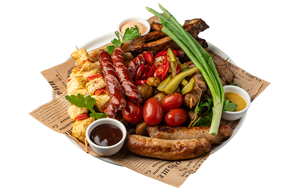 Домашняя колбаса, свиные рёбра с румяными драниками и беконом