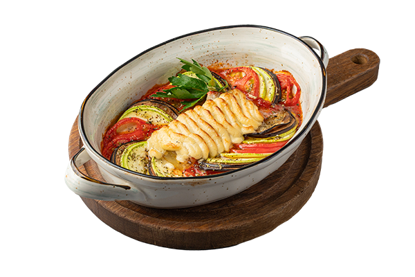 Филе морского окуня запеченное с соусом айоли и овощами рататуй