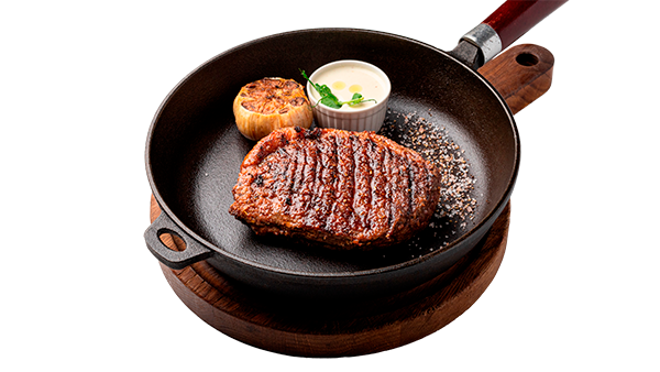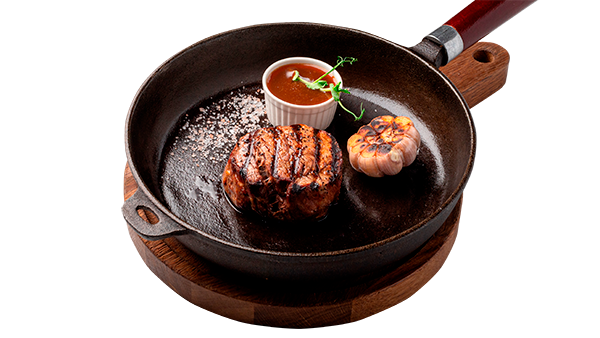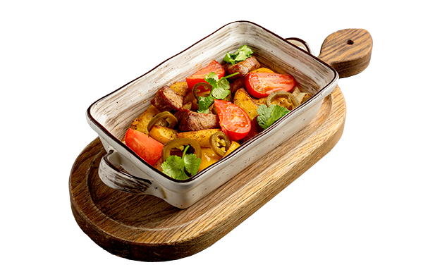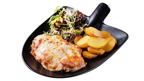 Свиная отбивная с шампиньонами, томатами и молодым картофелем