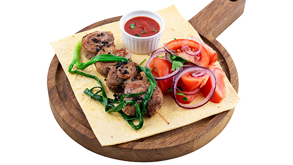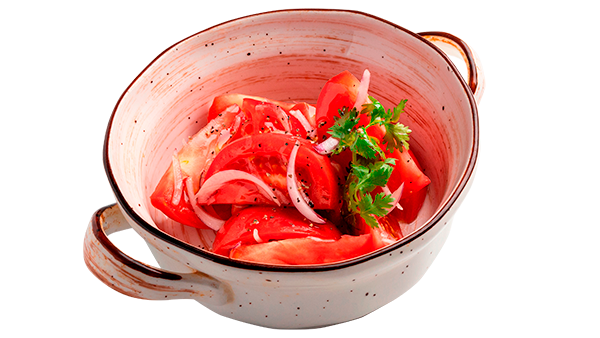 Брошет из свиной вырезки с беконом, салатом из свежих помидоров и красным луком