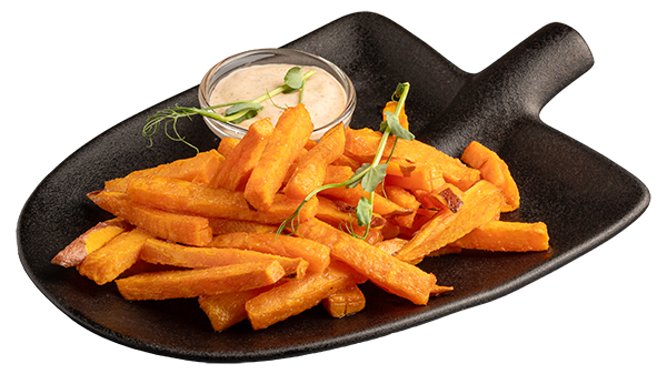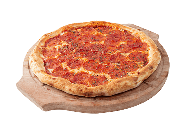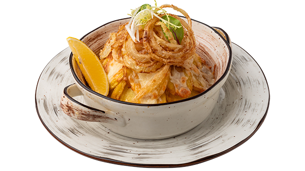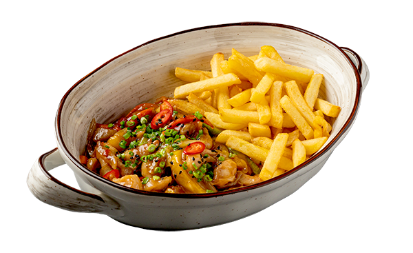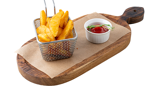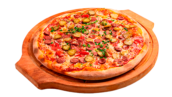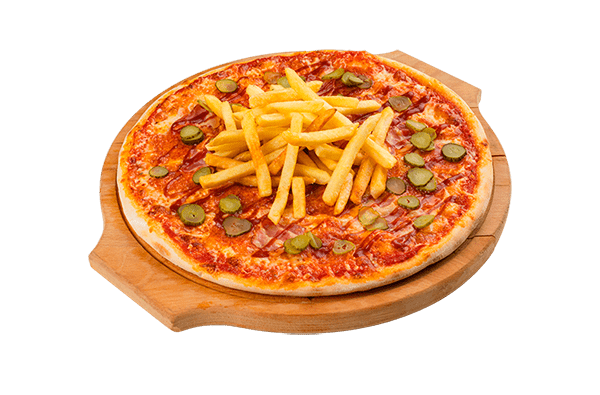 Томатный соус, бекон, пепперони, сыр моцарелла, корнишоны, картофель фри