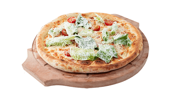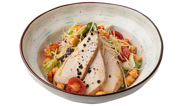 Филе цыпленка, сыр моцарелла, соус цезарь, помидоры черри, зеленый салат, пармезан