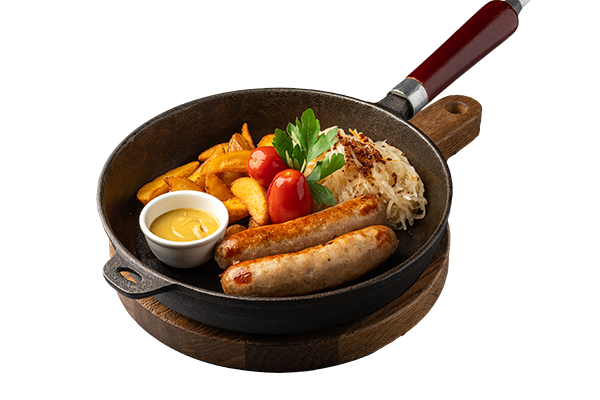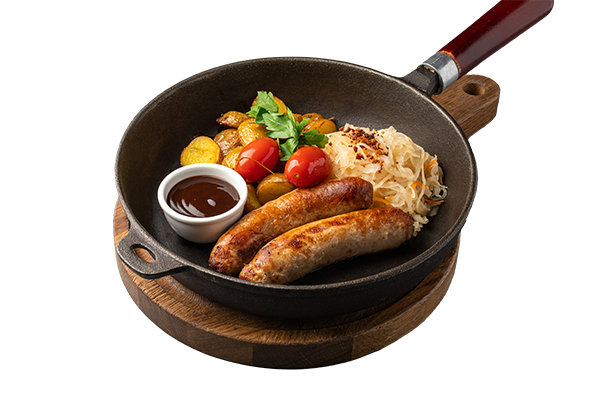 Свиные колбаски с молодым картофелем, тушеной капустой с беконом и соусом BBQ