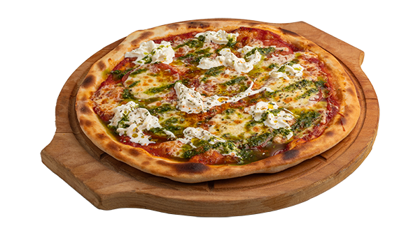 Томатный соус, сыр моцарелла, помидоры, сыр страчателла, песто соус