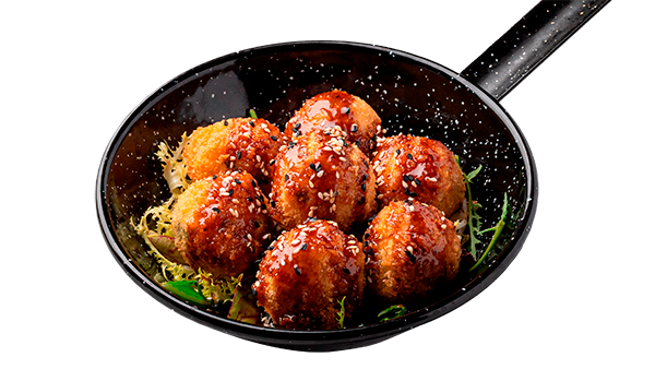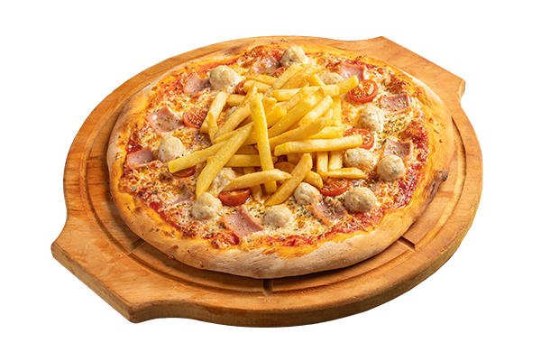 Томатный соус, куриные фрикадельки, ветчина, помидоры, сыр моцарелла, картофель фри