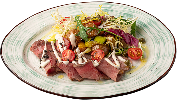 Ростбиф с обжаренными овощами, листьями салата и соусом из тунца