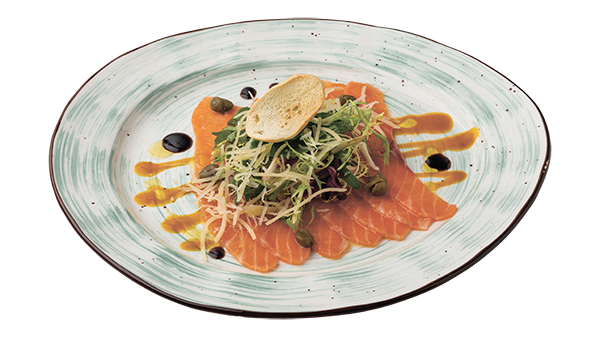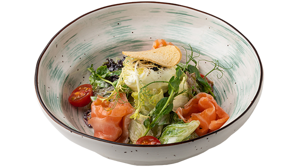 Зеленый салат со слабосоленым лососем, яйцом пашот и соусом блю-чиз