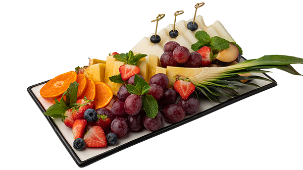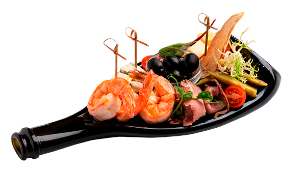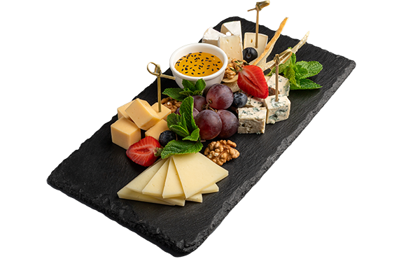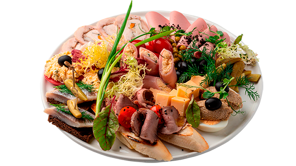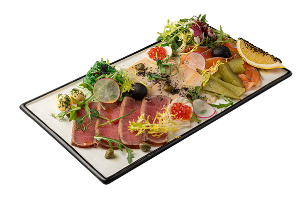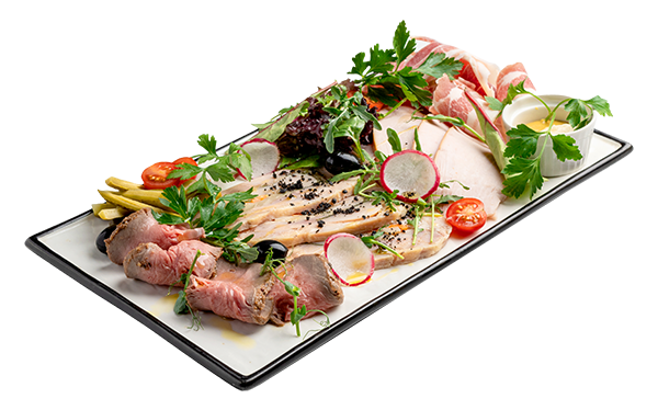 Ростбиф, сыр гауда, сыр дор-блю, маслины, креветки, корнишоны и помидоры черри