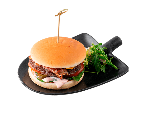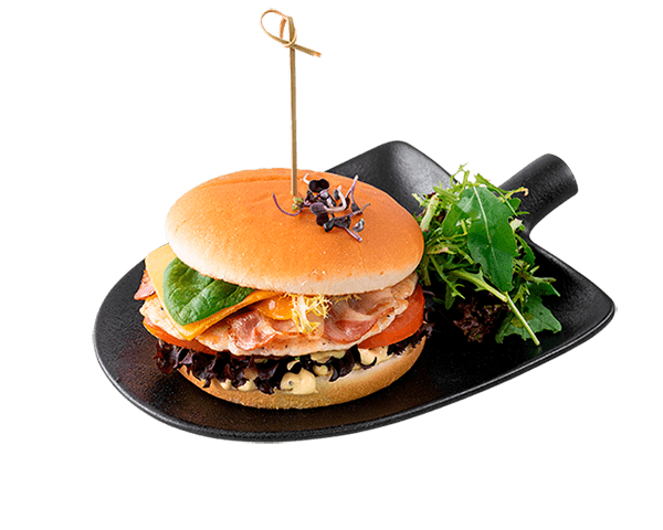 Чизбургер с цыпленком, овощами, соусом карри, беконом и сыром