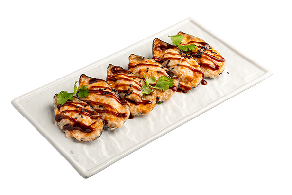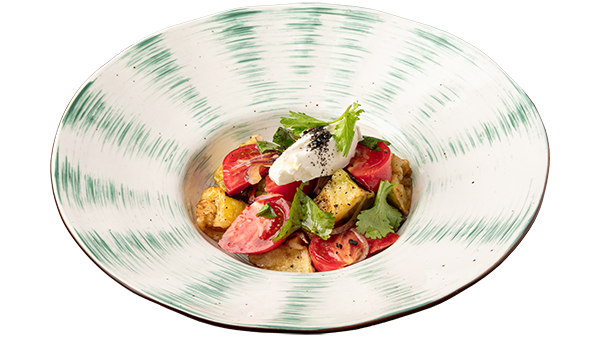 Салат из жаренных баклажанов с томатами, сливочным сыром и соусом понзу