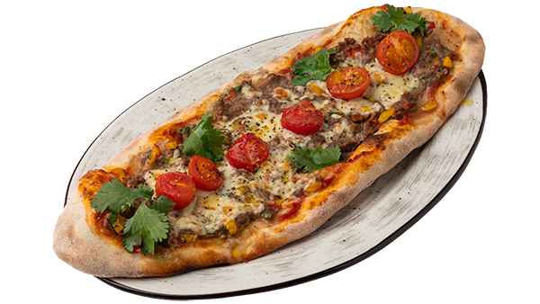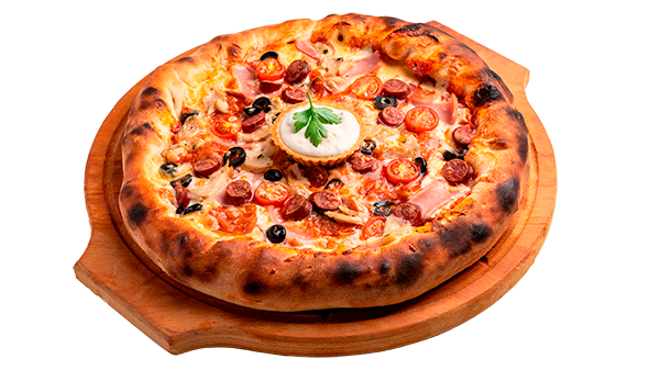 Томатный соус, куриное филе, филе копченной индейки, пепперони, охотничьи колбаски, ветчина , шампиньоны, красный лук, сыр моцарелла, помидоры черри, маслины, соус блю чиз