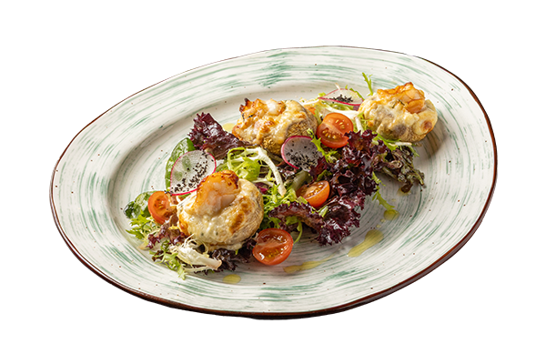 Зеленый салат с шампиньонами, запеченными с креветками и сыром