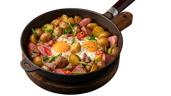 Жареный картофель с докторской колбасой, глазуньей, беконом и луком