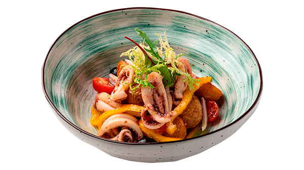 Теплый салат со щупальцами кальмара, молодым картофелем и овощами