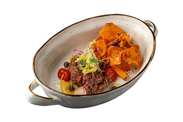 Тартар из мраморной говядины, с каперсами, горчицей и чипсами из батата