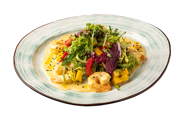 Салат из тёплых креветок в соусе из манго с кокосовым молоком и свежими ягодами